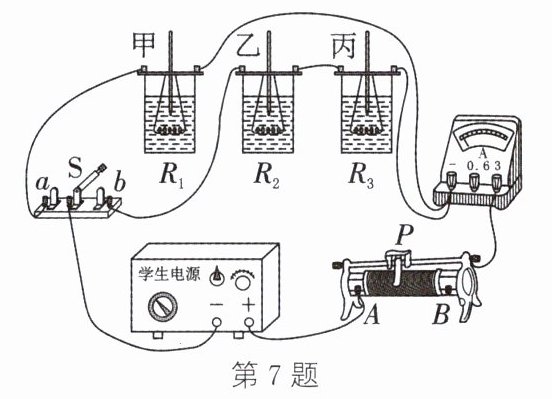 7. (2024·无锡)用如图所示的装置探究影响电流热效应的因素,甲、乙、丙三个相同的容器内均装有质量相等的煤油,电阻丝$R_1$、$R_2$、$R_3$浸没在煤油中,其中$R_1=R_2=5 \Omega$,$R_3=10 \Omega$。闭合开关前,记录下煤油的初温度$t_0$。开关S接$a$,调节滑动变阻器滑片$P$,使电流表的示数为$1 A$,记录下第$100 s$和第$200 s$时甲容器中煤油的末温度$t$;开关S接$b$,调节滑片$P$,使电流表的示数为$0.5 A$,记录下第$200 s$时乙、丙容器中煤油的末温度$t$,断开开关。结果如表,比较序号①②可得:当通过导体的电流和导体的