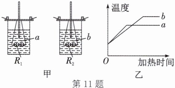 11. (2025·苏州)如图甲,两个相同的容器中分别装有液体$a$、$b$,液体$a$的质量大于$b$的质量。用两个电热丝分别对液体$a$、$b$加热,电热丝$R_1$的阻值大于$R_2$的阻值,工作电压相同,且电热丝产生的热量均被液体吸收,液体$a$、$b$温度随时间的变化关系如图乙。下列说法正确的是