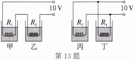 13. 如图所示,甲、乙、丙、丁四个相同容器里装有质量和初温相同的水,每个容器放入同种材料绕成的导电线圈,其中电阻$R_1=R_3$,$R_2=R_4$,$2R_2=3R_1$,若同时通电,不考虑热量损失,经过一段时间后这四个容器中的水温从高到低的顺序是