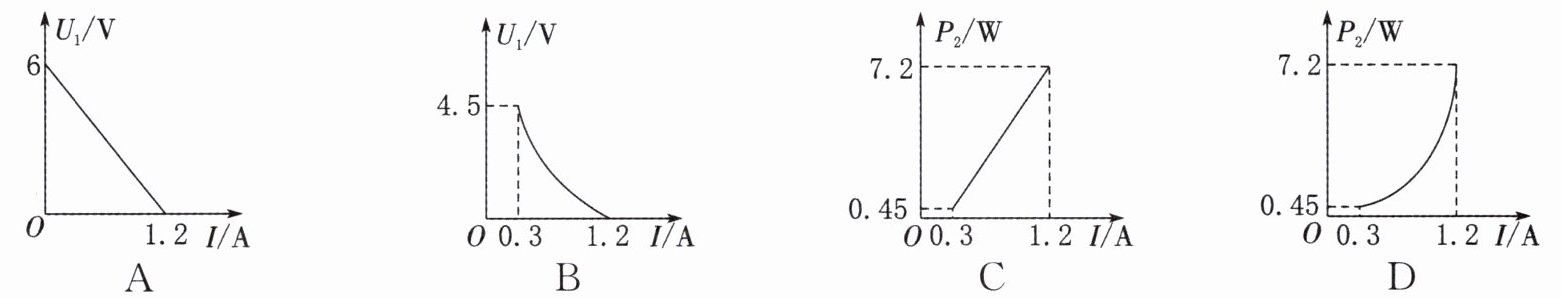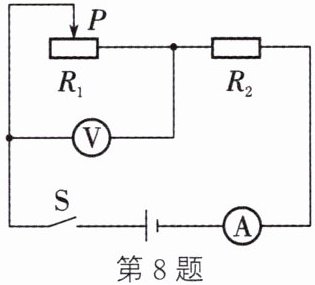 8. 如图所示的电路中,电源电压保持$6 V$不变,滑动变阻器的最大阻值为$15\Omega$,定值电阻$R_2$为$5\Omega$。电压表示数为$U_1$、$R_2$的电功率为$P_2$、电流表示数为$I$。闭合开关后,移动滑片$P$,下列图像可能正确的是 (