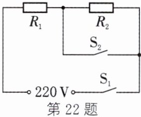(2)当$S_1$、$S_2$都闭合时,电路中只有$R_1$,为高温挡,根据$R=\frac{U^2}{P}$,$R_1=\frac{U^2}{P_{高}}=\frac{(220V)^2}{1100W}=44\Omega$;当$S_1$闭合、$S_2$断开时,$R_1$、$R_2$串联,为低温挡,串联总电阻$R_{串}=\frac{U^2}{P_{低}}=\frac{(220V)^2}{110W}=440\Omega$,所以$R_2=R_{串}-R_1=440\Omega - 44\Omega=396\Omega$。