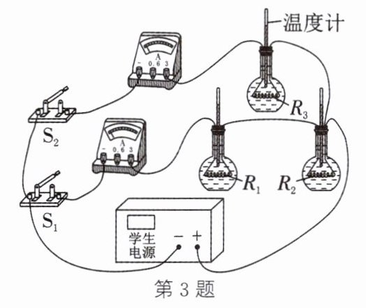 3. 用如图所示的装置探究影响电流热效应的因素,三个相同的烧瓶内均装有质量相等的煤油,电阻丝$R_1$、$R_2$、$R_3$浸没在煤油中,其中$R_1=R_3=6\ \Omega$、$R_2=3\ \Omega$。闭合开关前,记录下煤油的初温度$t_0$;接通电源,同时闭合开关$S_1$、$S_2$,记录下电流$I$,通电相同时间,记录下煤油的末温度$t$,结果如表所示,则$R_1$、$R_2$所在锥形瓶中的煤油升温所吸收的热量之比为