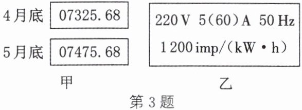 3. 小明4月底和5月底观察到自己家里的电能表如图甲所示,电能表的技术参数如图乙所示,则: