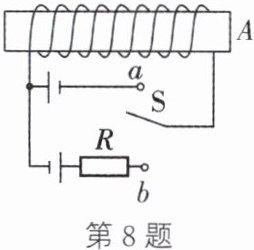 8. 如图所示,开关由触点$a$ 改接到触点$b$ 时,电磁铁的磁性强弱及$A$ 端的极性变化