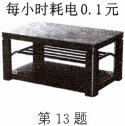 13. (新情境·日常生活)如图所示为某品牌电暖桌的宣传语“每小时耗电0.1元”,为了验证其真实性,某物理兴趣小组调研发现,其在最低挡位状态下,接入电路的发热电阻是$80\ \Omega$,若将它接到220 V的电路中,则: