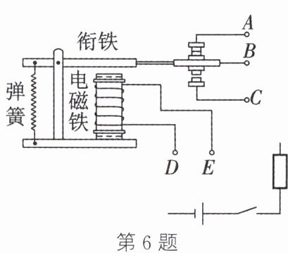 6. 通常我们把没有铃碗的电铃叫作蜂鸣器。请用笔画线代替导线,将图中的元件符号连接在电磁继电器上,组成一个蜂鸣器的电路。