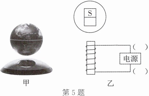 5. 如图甲是磁悬浮地球仪,闭合开关后,地球仪可以悬浮在空中。图乙是其内部结构示意图,请根据图示条形磁体的极性,在图乙中标出电磁铁的 N 极、电源的“+”“-”极。
