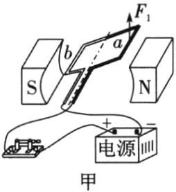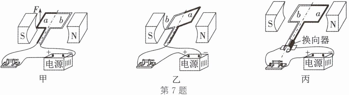 7. 如图甲所示,线圈位于磁场中,通电后 a 段导线受磁场力 F 的方向向上。请在图乙中画出 a 段导线受到的磁场力$F_1$的示意图;现增加一个换向器,如图丙所示,请在图丙中画出通电后 a 段导线受到的磁场力$F_2$的示意图。
