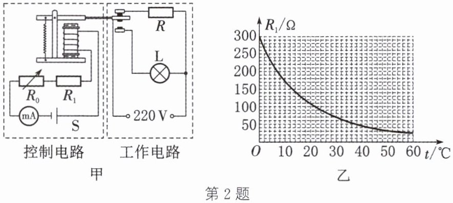 【设计与实施】设计温控系统。温控系统原理如图甲,控制电路的电源电压为$6\ V$,电阻箱$R_{0}$的阻值调为$90\ \Omega$,热敏电阻$R_{1}$的阻值随温度的变化图像如图乙。当控制电路中的电流达到$30\ mA$时,衔铁被吸下;当电流降低到$25\ mA$时,衔铁被弹回。已知工作电路中电热丝$R$的电阻为$22\ \Omega$,浴霸灯L标有“$220\ V\ \ 275\ W$”字样。