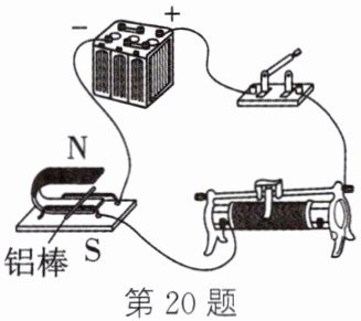 20. 如图所示的实验中,闭合开关,观察到铝棒向左运动,实验现象说明磁场对