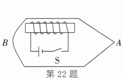 22. 如图所示,玩具船上有一个由电池和带铁芯的细长螺线管组成的电路,小船漂浮在水面上,船头$A$指向东,船尾$B$指向西。闭合开关$S$后,船头$A$最终指向 (