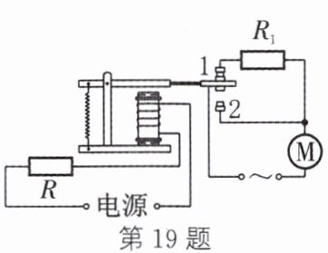 19. (2024·淮安淮阴段考)小明去超市,走到电梯前发现电梯运动较慢,当他站在电梯上时电梯运动又快了起来。小明根据所学的知识画出如图所示的电路($R$ 是一个力敏电阻)。小明分析:当人站在电梯上时,力敏电阻的阻值减小,电磁铁的磁性变