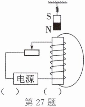 27. (2025·济宁模拟)如图所示,弹簧下悬挂着一条形磁铁处于静止状态,闭合开关后将滑动变阻器的滑片向左移动则弹簧的长度会增大。请标出电源左端的极性及通电螺线管下端的磁极名称和图中磁感线的方向。