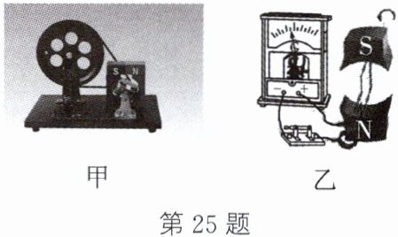 25. (易错题)如图甲所示为手摇交流发电机的模型,将小灯泡与该发电机串联,摇动手柄会看到小灯泡发光;如图乙为交流发电机的原理图。下列说法不正确的是 (