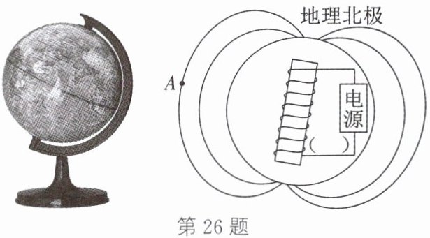 26. (2025·遂宁)小聪将通电螺线管放入地球仪来模拟地磁场,请在图中用箭头在$A$点标出该处磁感线方向,并在括号内用“$+$”或“$-$”标出电源下端的极性。