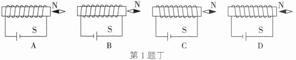 (5) 为了研究通电螺线管的磁极性质,同学们一起对螺线管的电流方向和绕线方式进行了实验,得到了如图丁的四种情况。实验说明通电螺线管的磁极极性只与