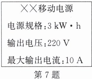 7. (新情境·日常生活)(2025·枣庄)某商家销售的移动电源相当于大型“充电宝”,其铭牌如图所示。顾客咨询:“该移动电源可以供2.5 kW的用电器正常工作吗?”客服回复:“没问题,这是3 kW·h的,3 kW的用电器都可以正常使用。”该客服