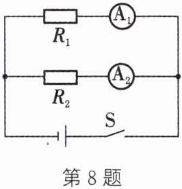 8. 如图所示的电路中,闭合开关S,电流表$A_1$的示数为0.6 A,电流表$A_2$的示数为0.2 A,电阻$R_1$消耗的电功率为1.8 W。求: