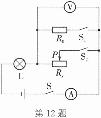答案:12. (1) 小灯泡的额定电流$I_{额} = \frac{P_{额}}{U_{额}} = \frac{3.6\ W}{6\ V} = 0.6\ A$ (2) 小灯泡的电阻$R_{L} = \frac{U_{额}}{I_{额}} = \frac{6\ V}{0.6\ A} = 10\ \Omega$ (3) 只闭合开关S、S₁,L 与R₀ 串联,小灯泡恰好正常发光,电路中电流$I = I_{额} = 0.6\ A$,电源电压$U = I(R_0 + R_{L}) = 0.6\ A×(20\ \Omega + 10\ \Omega) = 18\ V$ (4) 只闭合 S、S₂ 时,L 与Rₓ 串联,滑动变阻器Rₓ 上标有“200 Ω 1.25 A”的字样,电流表A 的量程为0~3 A,小灯泡的额定电流为0.6 A,因串联电路中电流处处相等,则为了保护电路的安全,电路中的最大电流$I_{最大} = I_{额} = 0.6\ A$,此时小灯泡正常发光,则电压表的最小示数$U_{x最小} = U - U_{额} = 18\ V - 6\ V = 12\ V < 15\ V$,不会损坏电压表,变阻器Rₓ 的最小阻值$R_{x最小} = \frac{U_{x最小}}{I_{最大}} = \frac{12\ V}{0.6\ A} = 20\ \Omega$;当滑片向右滑动时,其接入电路的电阻变大,电流变小,根据分压原理,变阻器两端电压即电压表示数变大,由于电压表使用的量程为0~15 V,可得$U_{x最大} = 15\ V$,此时电路中的最小电流$I_{最小} = \frac{U - U_{x最大}}{R_{L}} = \frac{18\ V - 15\ V}{10\ \Omega} = 0.3\ A$,变阻器Rₓ 的值$R_{x最大} = \frac{U_{x最大}}{I_{最小}} = \frac{15\ V}{0.3\ A} = 50\ \Omega$,故滑动变阻器Rₓ 能接入电路的阻值范围是20~50 Ω