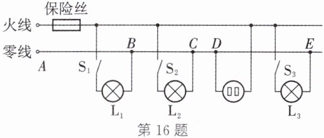 16. (2025·常州模拟)如图所示的电路中,开关都闭合后,三盏灯均正常发光,突然灯泡$L_3$熄灭,经检查保险丝完好,用测电笔测试插座的两孔,氖管均发光。造成这一现象的原因 (