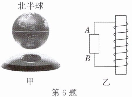 6. (2024·白银)如图甲所示为磁悬浮地球仪,悬浮时球体只能绕着“地轴”转动,它的“南”“北”指向与地球实际方位一致;地球仪中有一个磁铁,它的磁场与地磁场分布特点一致;环形底座内有一电磁铁,其电路原理如图乙所示。地球仪工作时,球体悬浮于空气中,则图甲中球体上方是“地磁场”的