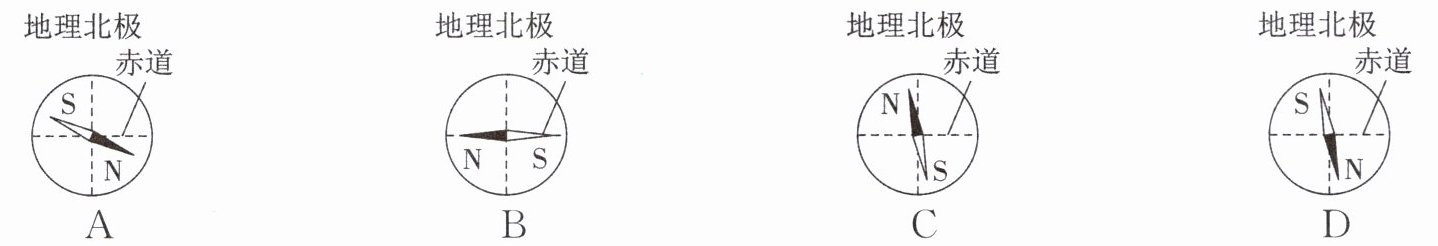 3. 宋代学者沈括在《梦溪笔谈》中最早记载了地磁偏角:“以磁石磨针锋,则能指南,然常微偏东,不全南也。”图中小磁针的指向符合上述说法的是 (
