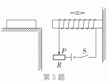 5. 如图所示,螺线管的上方放置一个小磁针,螺线管左边的水平地面上放置一个铁块。闭合开关$S$后,铁块静止不动,小磁针在磁场的作用下会发生转动,它的周围