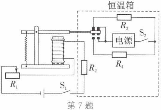 7. (跨学科实践·工程技术)(2025·苏州模拟)综合实践课上,小明制作了恒温箱系统,原理如图。控制电路由电磁继电器、滑动变阻器$R_1$、