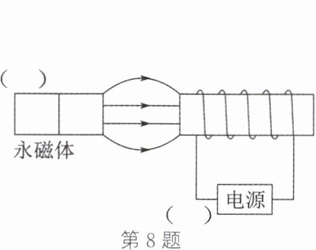 8. 根据如图所示磁感线方向,在相应的括号中,标出永磁体左侧的磁极(用“N”或“S”表示)和电源的极性(用“+”或“-”表示)。