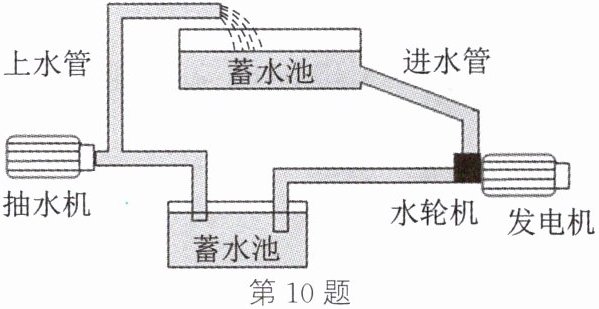 10. 小梦在学习完能量转化知识后,设想了如图所示的方案,先利用水力发电,然后利用发出的电驱动抽水机把水抽到蓄水池,这样就可以一直循环下去。你认为这个设计方案