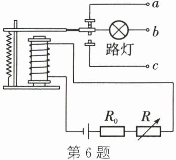 6. 如图所示,$R_0$是一个光敏电阻,光敏电阻的阻值随光照强度的增大而减小,$R$是电阻箱(已调至合适阻值),它们和继电器组成自动控制电路来控制路灯。白天灯熄,夜晚灯亮。下列说法正确的是 (
