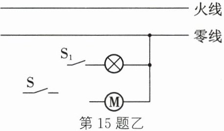 (2) 如图乙所示,只闭合开关S,风扇M工作;只闭合开关$S_1$,灯泡和风扇M都不工作;同时闭合开关S、$S_1$,风扇M和灯泡都工作。请用笔画线代替导线把电路连接完整。