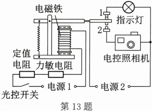 13. 如图所示为一种“闯红灯违规证据模拟记录器”的工作原理图,光控开关接收到红绿灯发出的红光时会自动闭合,力敏电阻若同时受到车的压力,其阻值变小,电路中电流变大,电磁铁的磁性