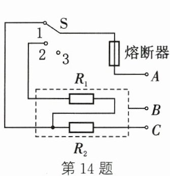 14. 如图所示为某家用电热器的工作原理示意图,$R_1$、$R_2$是发热电阻,两电阻的阻值均恒定为48.4 $\Omega$,虚线框表示电热器的金属外壳。用一个单刀三掷开关可以实现电热器开关机和多挡位切换。