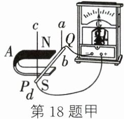 (1) 如图甲,为了验证猜想1是否正确,小明将磁体A放在水平面上,驱动装置(由两根绝缘硬棒$ab$、$cd$组成)使导体PQ以3.0 cm/s的速度水平匀速向右运动(导体运动区域的磁场强弱相同),读出小量程电流表的示数为6 mA。然后,将磁体A上下颠倒,使导体PQ仍以3.0 cm/s的速度水平匀速向右运动,发现小量程电流表的示数仍为6 mA。这说明猜想1是