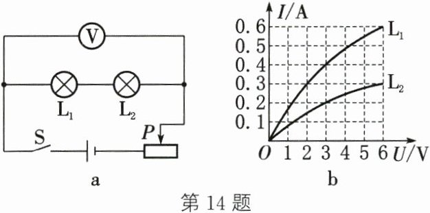 14. 如图$a$所示电路,电源电压为$9 V$且不变,两灯的额定电压均为$6 V$,两灯的$I$-$U$图像如图$b$所示。闭合开关$S$,调节滑动变阻器的滑片$P$,直至其中一个灯泡正常发光,则