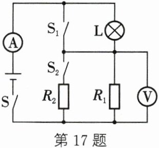 答案:17.(1)当开关S闭合,$S_{1}$、$S_{2}$都断开时,小灯泡L与电阻$R_{1}$串联,电压表测$R_{1}$两端的电压,因为串联电路中各处的电流相等,且小灯泡L正常发光,所以,由$P=UI$可得,电路中的电流$I=\frac{P_{L}}{U_{L}}=\frac{1.2W}{3V}=0.4A$,由$I=\frac{U}{R}$可得,电压表的示数$U_{1}=IR_{1}=0.4A×15\Omega=6V$ (2)因串联电路中总电压等于各部分电压之和,由(1)可得,电源的电压$U=U_{L}+U_{1}=3V+6V=9V$,当开关S、$S_{1}$闭合,$S_{2}$断开时,电路为$R_{1}$的简单电路,电流表测电路中电流,则电流表的示数$I_{1}=\frac{U}{R_{1}}=\frac{9V}{15\Omega}=0.6A$ (3)当开关S、$S_{1}$、$S_{2}$都闭合时,$R_{1}$与$R_{2}$并联,因为电路中总功率等于各部分消耗的功率之和,所以,电路的总功率$P=\frac{U^{2}}{R_{1}}+\frac{U^{2}}{R_{2}}=\frac{(9V)^{2}}{15\Omega}+\frac{(9V)^{2}}{30\Omega}=8.1W$