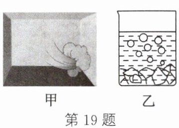19. 如图所示,图甲中房间里的空气自动聚拢到某个角落;图乙中,一杯水的内能突然集中在这杯水的上层,从而使上面的水剧烈沸腾,而下面的水却结了冰。你认为这两种情况有可能发生吗?