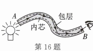 16. 如图所示是光纤传输光信号的原理图,光纤是由非常细的玻璃纤维构成的,光源发出的光线基本是笔直地进入一端,它主要是利用光线的