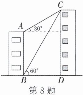 8. ($2024·$德阳)如图,某校学生开展综合实践活动,测量一建筑物$CD$的高度,在建筑物旁边有一高度为$10$米的小楼房$AB$,小李同学在小楼房楼底点$B$处测得点$C$处的仰角为$60{°}$,在小楼房楼顶点$A$处测得点$C$处的仰角为$30{°}$($AB$,$CD$在同一平面内,点$B$,$D$在同一水平面上),则建筑物$CD$的高度为 (