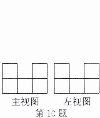 10. 在桌上摆着一个由若干个相同的小正方体组成的几何体,其主视图和左视图如图所示.设组成这个几何体的小正方体的个数为$n$,则$n$的最小值为