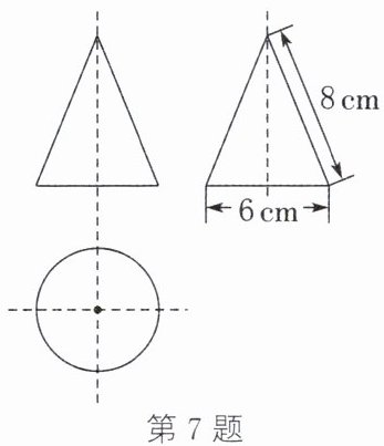 圆锥底面直径为$6\, cm$,则底面半径$r = \frac{6}{2}=3\, cm$,母线长$l = 8\, cm$。