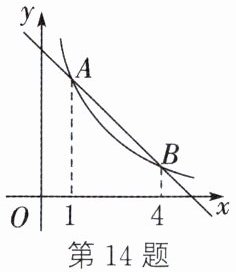 14. 如图,一次函数$y_1 = (k - 5)x + b$的图象与函数$y_2 = \frac{k}{x}(x > 0)$的图象相交于$A$,$B$两点,当$y_1 > y_2$时,$x$的取值范围是$1 < x < 4$,则$k$的值为