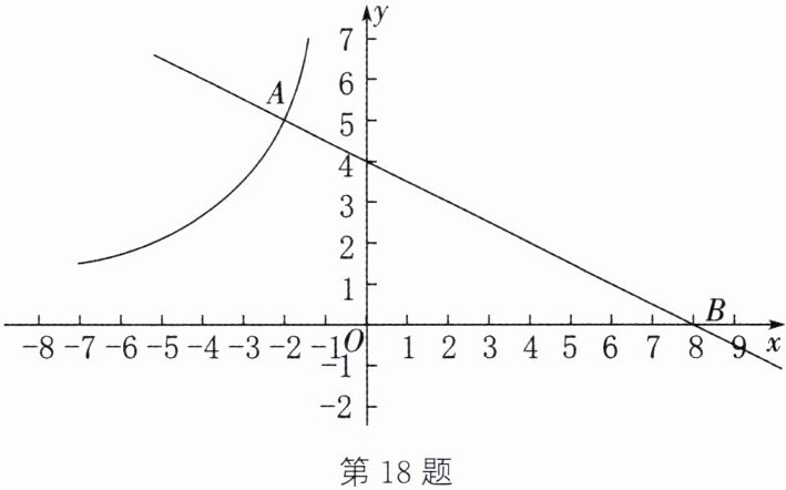 18. 如图,在平面直角坐标系中,直线$y = - \frac{1}{2}x + 4$与反比例函数$y = \frac{k}{x}$在第二象限的图象交于点$A( - 2,m)$,与$x$轴交于点$B$.