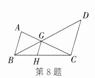8. 如图,AB//GH//CD,点 H 在 BC 上,AC 与 BD 交于点 G.若$\frac{AB}{CD} =\frac{2}{3}$,则$\frac{GH}{CD} =$