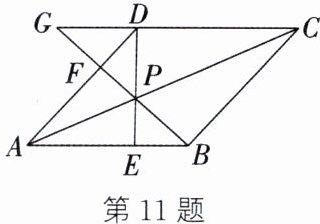 11. 如图,P 是菱形 ABCD 的对角线 AC 上的一点,连接 DP 并延长,交边 AB 于点 E,连接 BP 并延长,交边 AD 于点 F,交 CD 的延长线于点 G.