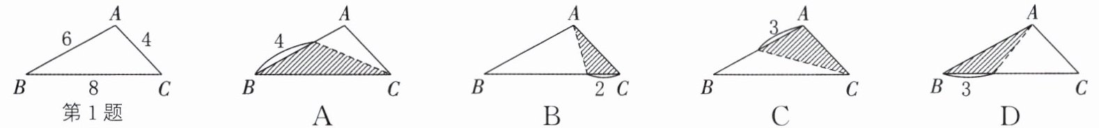 1. 如图,在三角形纸片 ABC 中,AB = 6,BC = 8,AC = 4. 在下列沿虚线剪下的阴影三角形中,与△ABC 相似的是 (