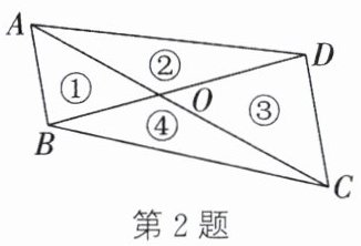 2. 如图,四边形 ABCD 的对角线 AC,BD 相交于点 O,且将这个四边形分成①②③④四个三角形.若 OA : OC = OB : OD,则下列结论中,一定正确的是 (