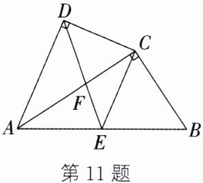11. 如图,在四边形$ABCD$中,$AC$平分$∠DAB$,$∠ADC = ∠ACB = 90^{\circ}$,$E$为$AB$的中点,连接$CE$,$DE$交$AC$于点$F$.