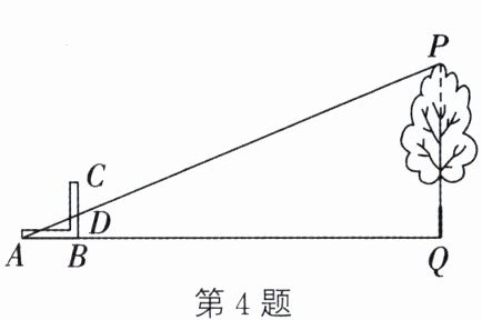 4. (新考向·数学文化)《周髀算经》中记载了“偃矩以望高”的方法.“矩”在古代指两条边呈直角的曲尺(即图中的 $ABC$). “偃矩以望高”的意思是把“矩”仰立放,可测量物体的高度. 小明同学依照此法测量学校操场边一棵树的高度,如图,点 $A, B, Q$ 在同一水平线上,$\angle ABC=\angle AQP=90^{\circ}, AP$ 与 $BC$ 相交于点 $D$. 测得 $AB=1.2 m, BD=0.5 m, AQ=9 m$,则树高 $PQ=$_________$ m$.